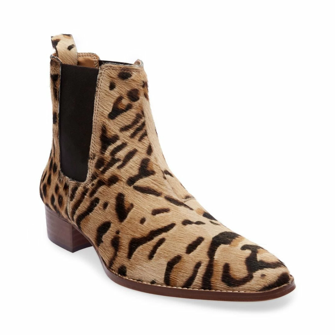 Fashion-lovinโ fellas are sure to go nuts over DEX-P, as this Chelsea boot makes a major statement with hairy leopard-spotted surfaces. Elastic gussets allow for easy pull-on entry and a short heel lends rock and roll vibes.